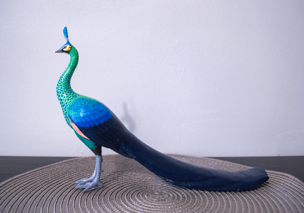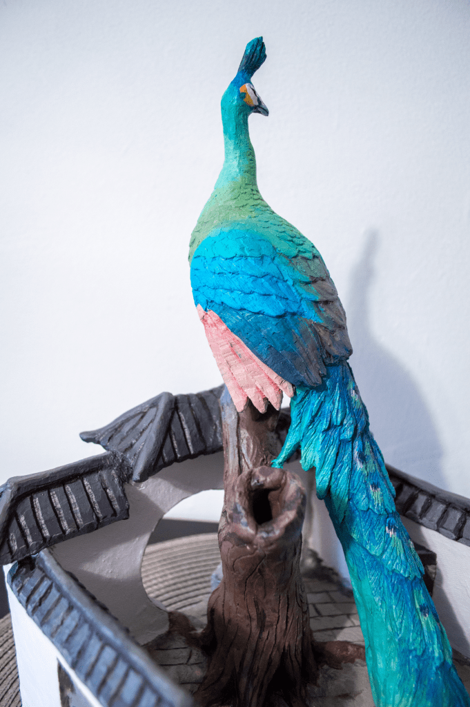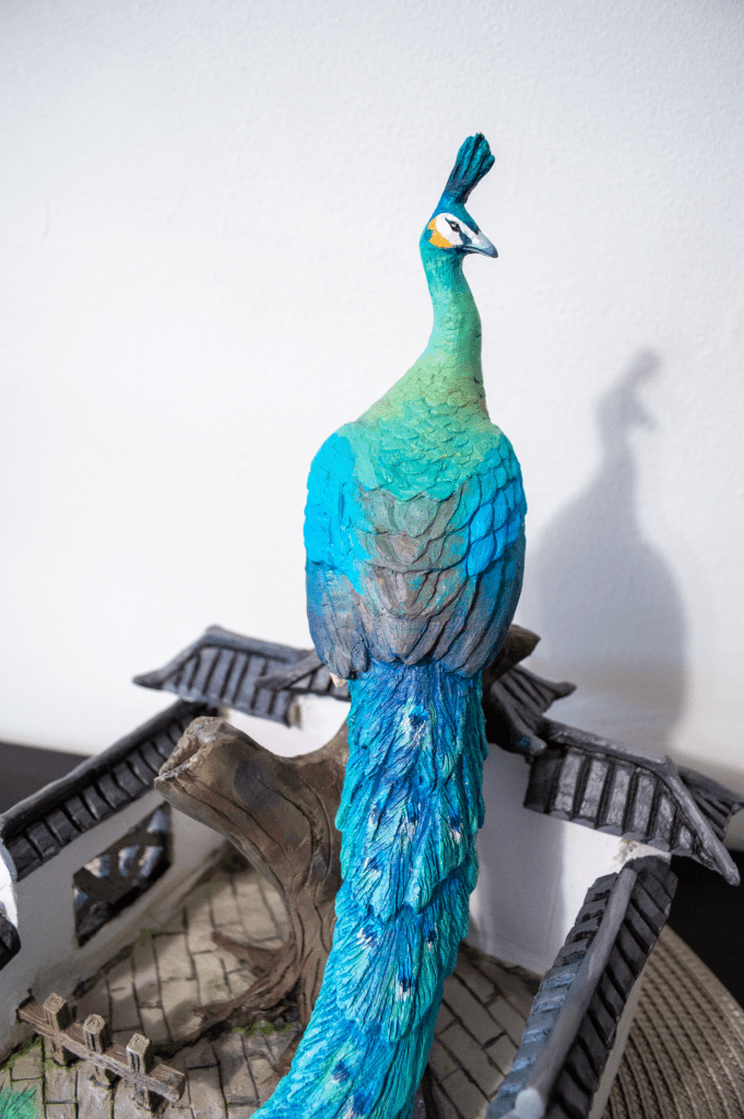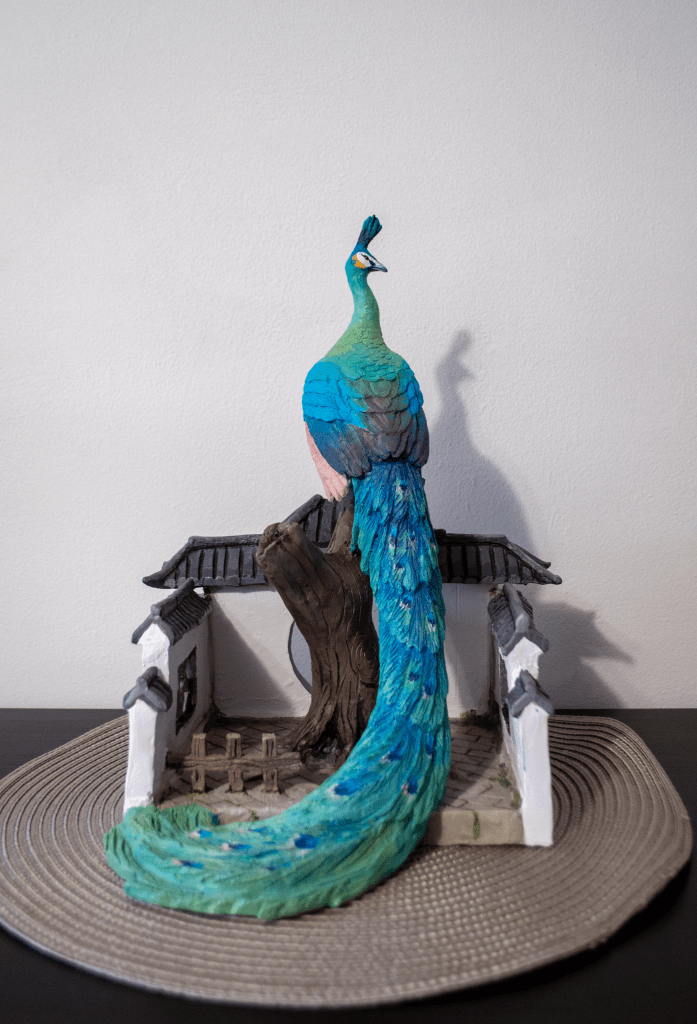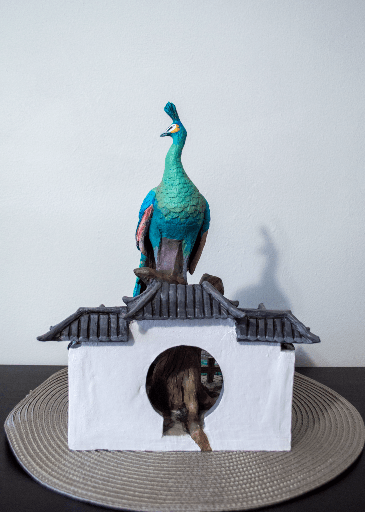 A peacock is standing on a tree in a Chinese garden